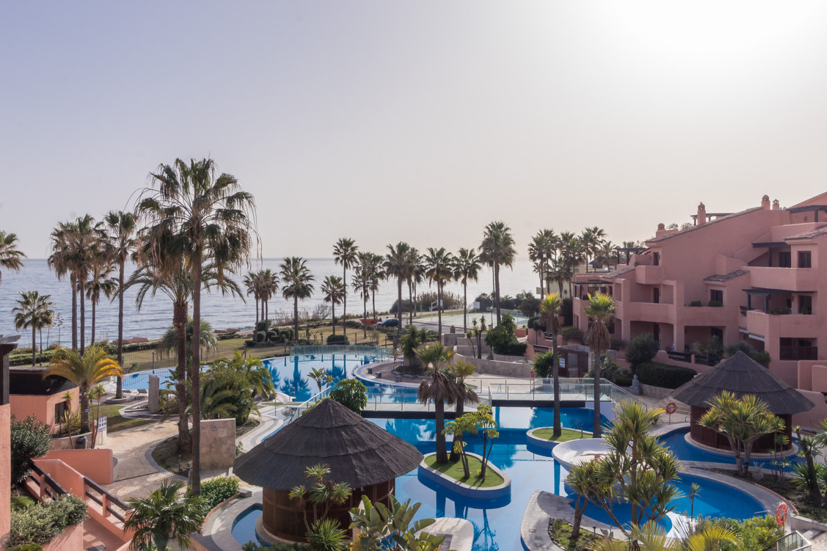 This beautiful and comfortable 3-bedroom, 2-bathroom property is located in one of Estepona’s most exclusive frontline beach developments. The spacious living/dining area with open plan klitchen and the main bedroom both offer direct access to the terrace, which connects to the private garden, creating a seamless indoor–outdoor living experience. The purchase price includes a private underground parking space and a storage room.