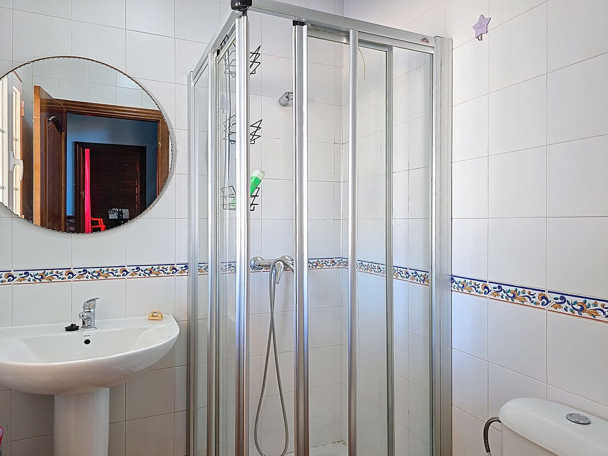 The ground floor includes an additional double bedroom and a full bathroom—perfect for hosting guests or creating a private living space for family members. From this level, you have direct access to the spacious sun terrace and private swimming pool.