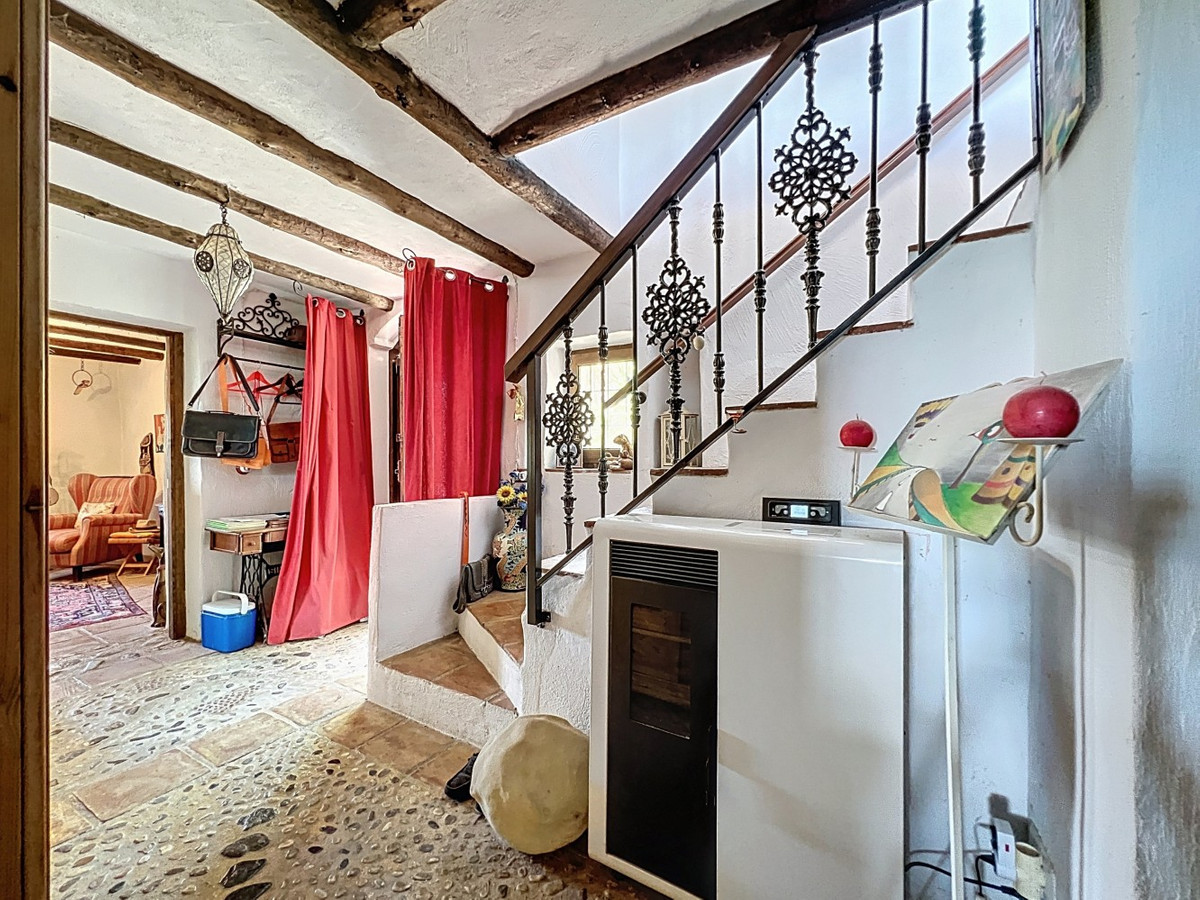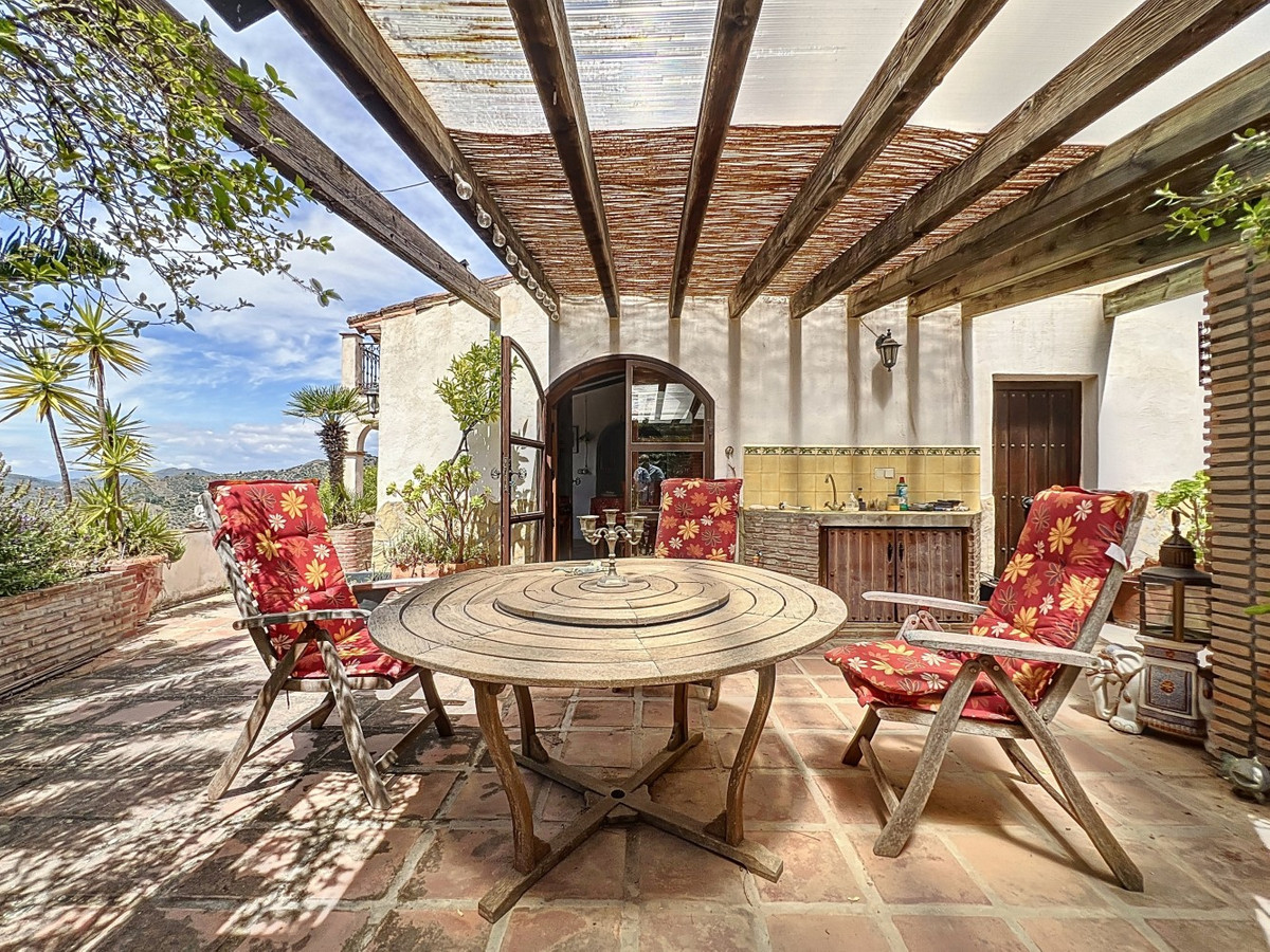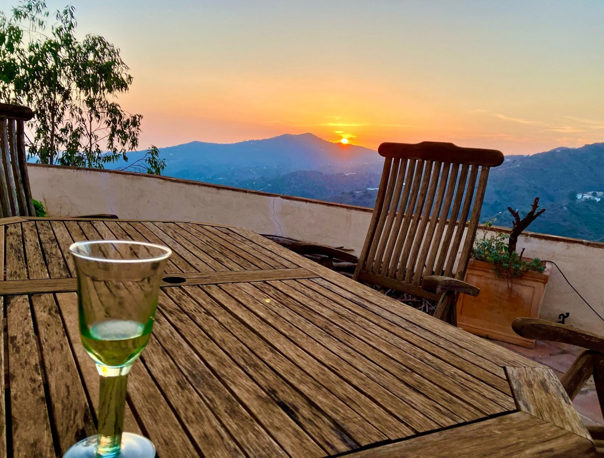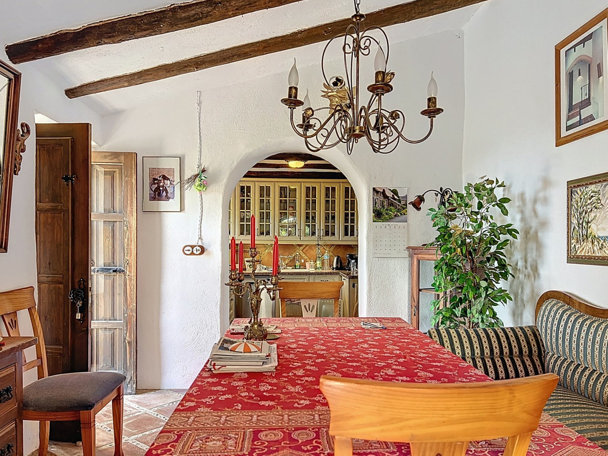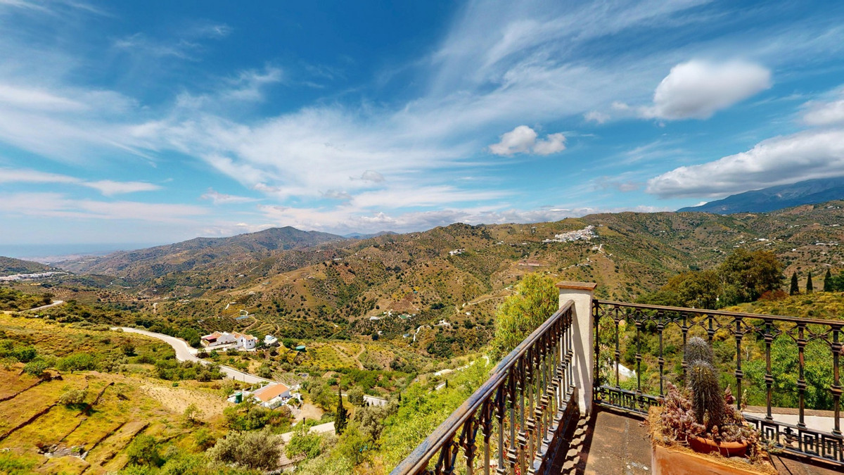 This charming Spanish country house in Sayalonga/Árchez, Málaga, blends traditional character with modern comfort all set against a backdrop of breathtaking views. The property offers a constructed area of 199 m2 and 148 m2 of living space spread over two floors, with three bedrooms and two bathrooms ideal for families or guests. Inside, rustic features dominate: exposed wooden beams under whitewashed ceilings add warmth and authenticity to every room. Terracotta tiles emphasize the Mediterranean style and create a harmonious overall aesthetic. A major highlight is the well-thought-out heating solution: a modern pellet stove in the hallway efficiently warms the entire house. Additionally, there's a cosy wood-burning stove in the living room and an infrared panel heater for extra comfort on cooler evenings. The bathrooms also feature electric infrared heaters to ensure a pleasant, warm atmosphere. Both the living room and bedrooms include built-in wardrobes that offer practical storage while blending seamlessly with the style. Plush furniture in warm red tones, decorative mirrors, colourful artworks, and personal collections give the space a relaxed, bohemian vibe. A striking archway connects the interior to one of the terraces and opens up to stunning views of the countryside. The kitchen is both charming and functional, with cream cabinets, granite countertops, modern appliances, and a patterned tile backsplash. A decorative extractor hood completes the picture. The two bathrooms are individually designed: one features a bathtub and artistic rustic tiles, while the other has a modern look with clean lines and contemporary fittings. Both complement the character of the house. The bedrooms reflect the Andalusian style, with wrought iron beds, wooden furniture, warm lighting, and the aforementioned built-in wardrobes that add comfort and order. Outside, several terraces offer spectacular views of the sea, rolling hills, and white villages. One of the terraces is covered and offers expansion potential ideal for one or two additional rooms. The outdoor area also includes a private pool, various seating areas, an outdoor kitchen, and a well-kept garden perfect for sociable evenings or quiet moments in nature. This villa combines timeless architecture with personal touches, thoughtful amenities, and spectacular views a true taste of Andalusian living. We are pleased to be able to present this dream property to you soon, either personally or via virtual viewing. Because this world is unique - just like our Axarquía. In Andalusia. On the Costa del Sol. Here, on the sunny side of life...