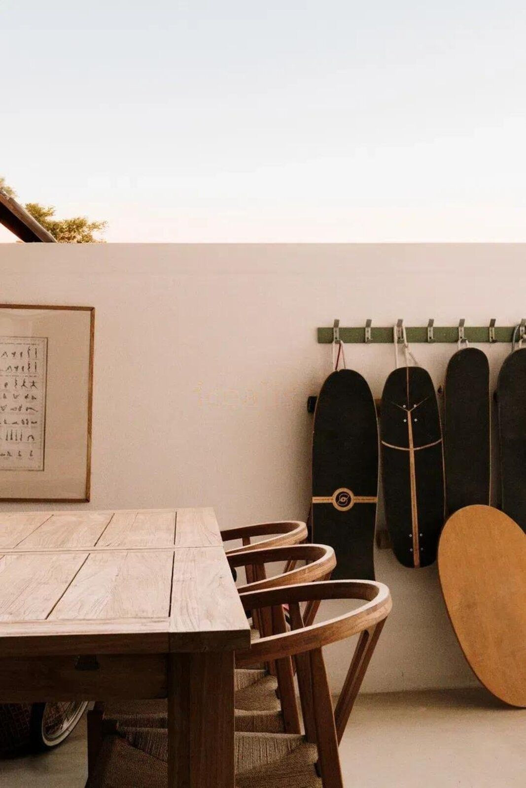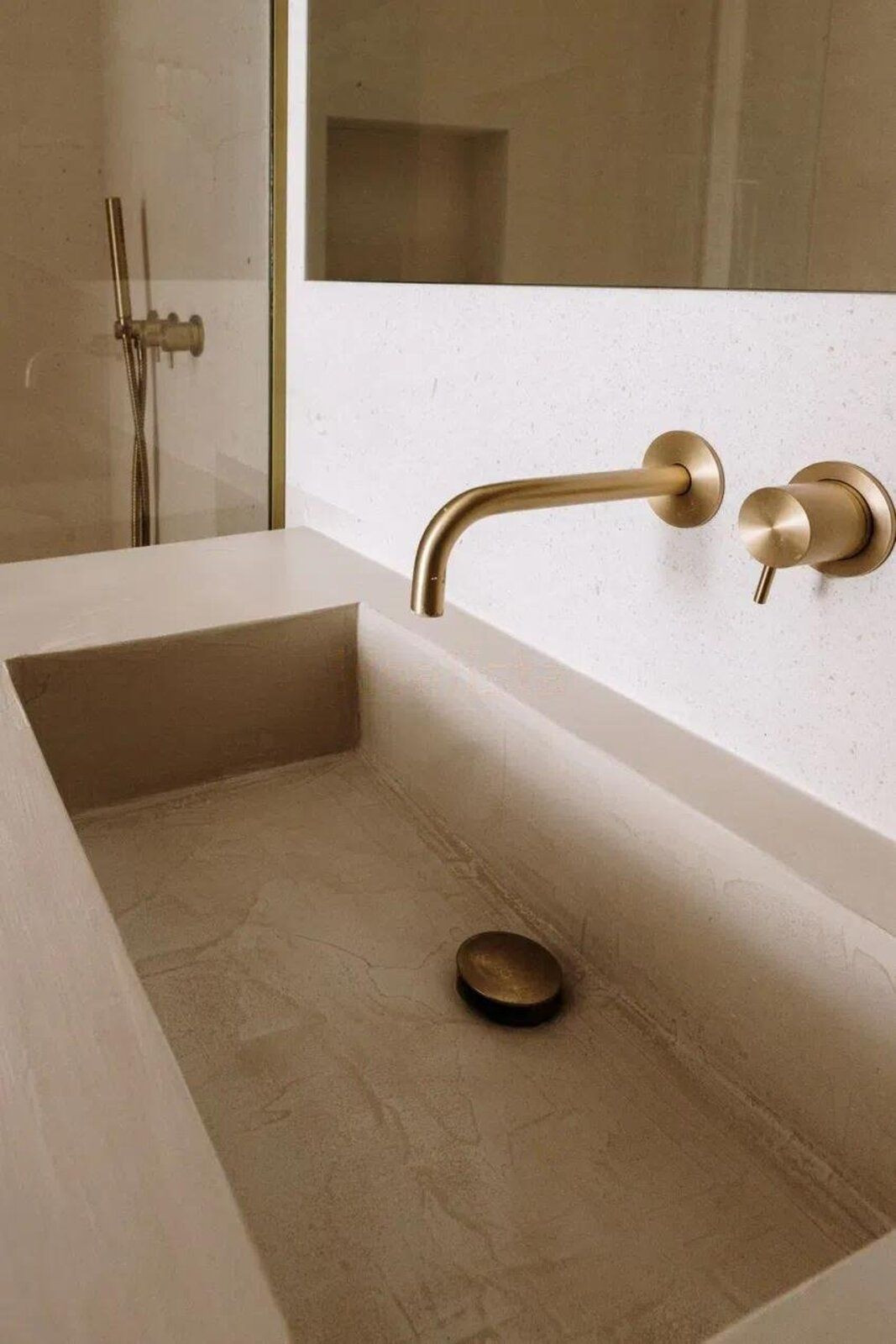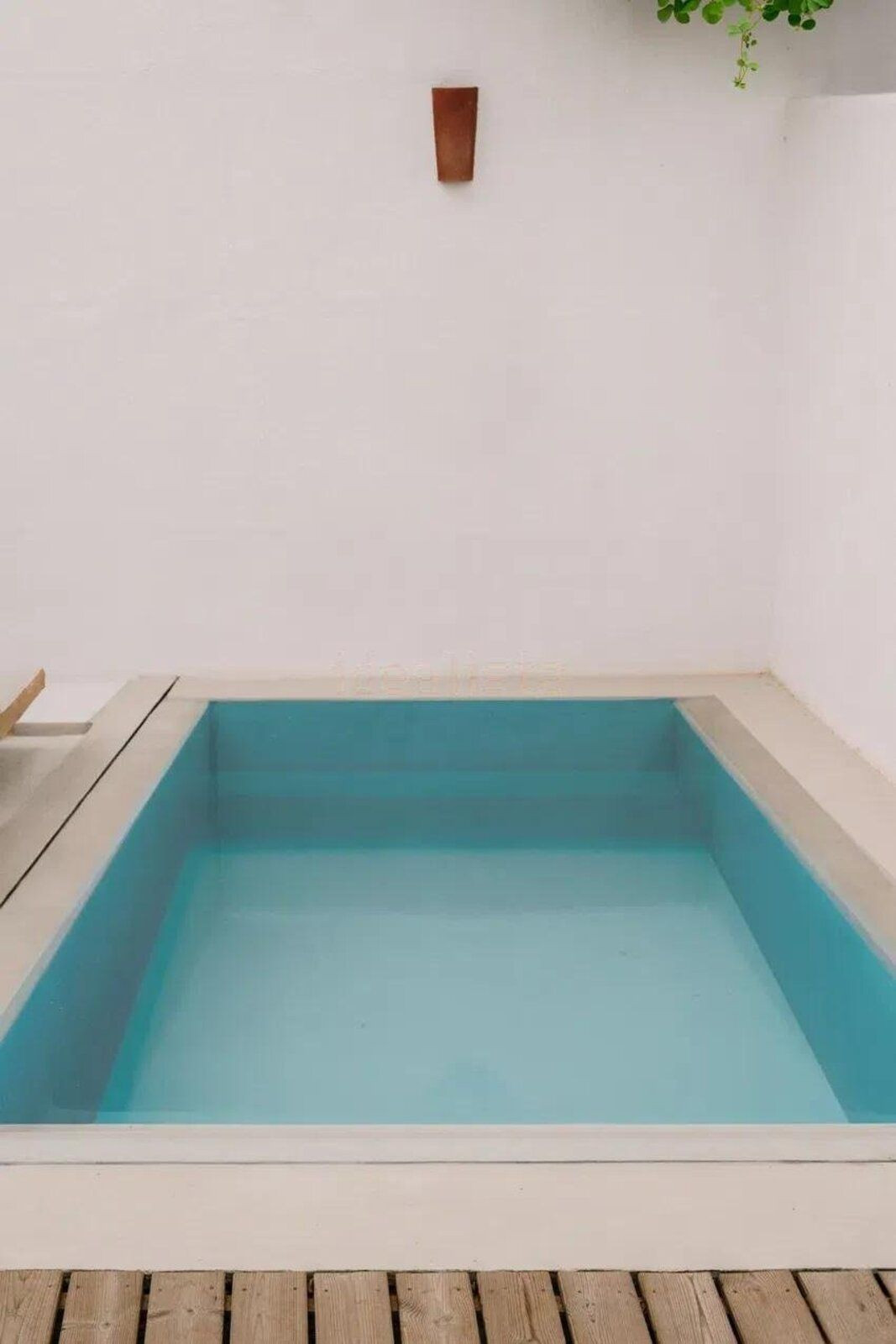Entrance patio with microcement finish, sunny living area all day long, planters, and outdoor shower with hot and cold water.