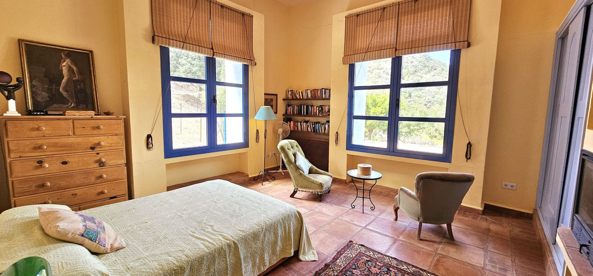 Access to the property is via a short dirt road that leads to a private electric gate, shared with just four other properties. As you ascend to the mountaintop, you’ll be greeted by an imposing antique wooden door that ushers you into a grand entry hall. To the left and right, you’ll find two en-suite guest bedrooms. Straight ahead, the magnificent living room beckons, cleverly divided into distinct areas by elegant pillars—an inviting lounge area with a generous fireplace, a dining area adjacent to the well-appointed kitchen, and a cozy music or study nook. French doors open seamlessly to the terrace, providing unobstructed views of the surrounding landscape and mountains. When all the doors are open, the distinction between indoor and outdoor living fades, allowing you to fully savor the Andalusian outdoor lifestyle.