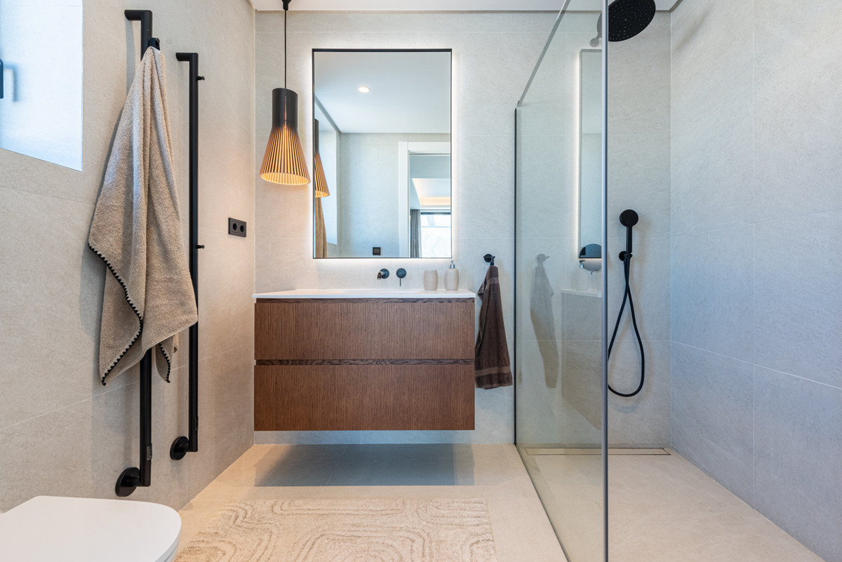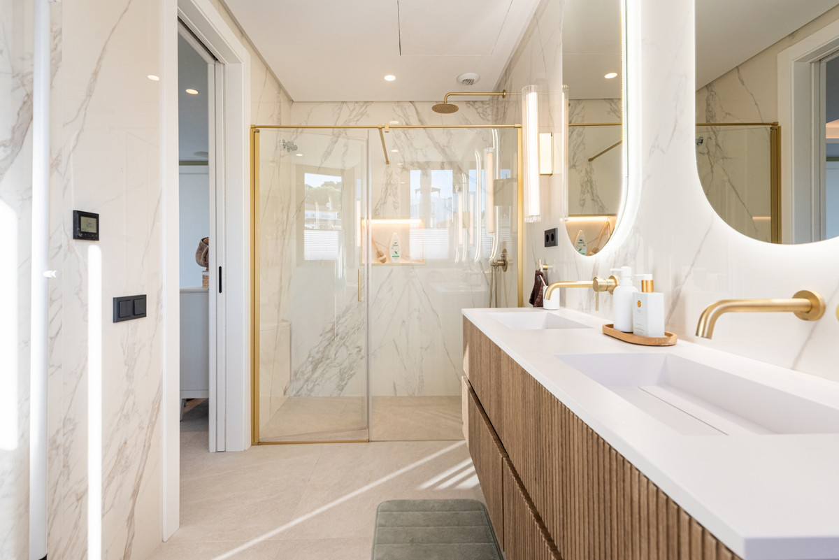 Upstairs, you’ll find two expansive bedroom suites, each with its own en-suite bathroom and direct access to a large terrace offering breathtaking views. A separate south-facing terrace leads to a spiral staircase taking you up to the impressive roof terrace.