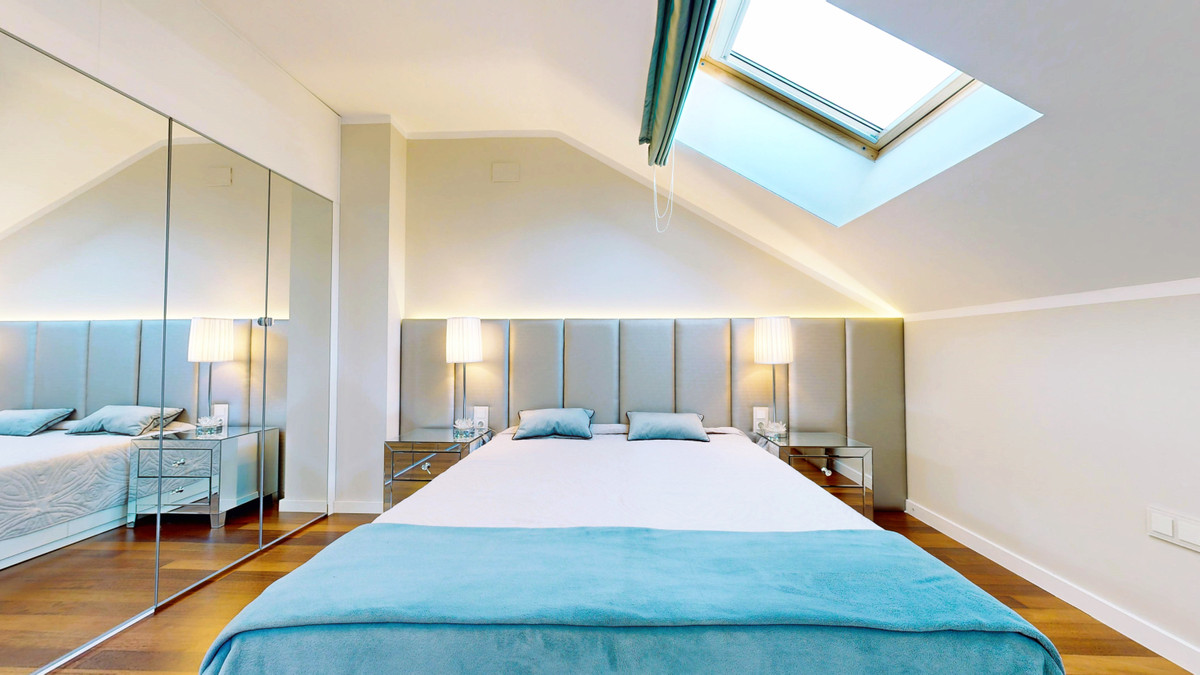 An elegant staircase leads to the upper floor, where you will find the attic-style master bedroom with two upper windows, storage space, and a full bathroom with shower. This level also features a generous walk-in wardrobe and independent air conditioning and heating (split system).