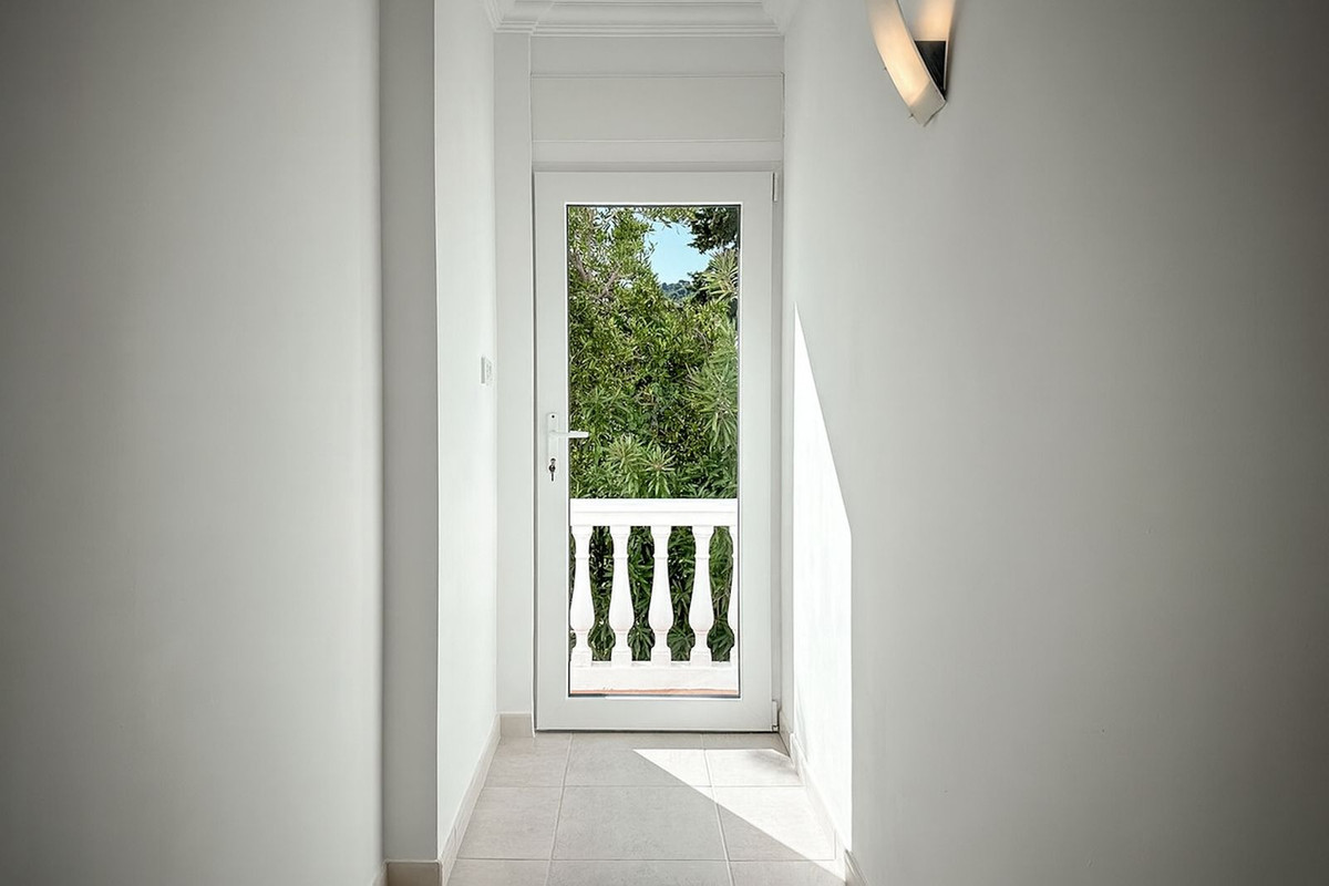 From the entrance hall there is access to the spacious living room through the double doors, or out onto the large terrace that is connected to both the living room and the kitchen. From the terrace it is possible to enjoy an incredible panoramic view of the surrounding nature.