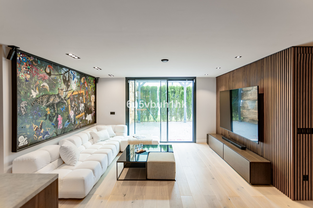 Located in the exclusive and secure community of Resina Golf in Estepona, this fully renovated villa offers an exceptional standard of luxury living. With meticulous attention to detail and high-end finishes throughout, the property combines contemporary design with functionality and comfort in one of the Costa del Sol’s most sought-after residential areas.Set on a 765m² private plot, the villa offers generous interior and exterior spaces across three levels. On the main floor, you’ll find a top-of-the-line open-plan kitchen by Decodan, seamlessly connected to a spacious living area with a designer fireplace. Large integrated windows provide stunning, unobstructed views of the Mediterranean Sea from every angle. This main level also includes a complete en-suite bedroom with a private dressing area and a guest toilet.The outdoor terrace of 190m² is designed to maximize the villa’s privileged setting. It features a heated infinity pool, a fully equipped barbecue area, a shaded pergola for al fresco dining, and a comfortable chill-out space—all with breathtaking views over the sea and the African coastline. The villa features a beautifully landscaped garden with an automatic irrigation system, located directly in front of the pool area. Mature trees and well-established plants create a lush, serene environment, offering both privacy and natural beauty throughout the year.The upper level features two expansive en-suite bedrooms, a dedicated workspace, and a 55m² terrace perfect for relaxing under the sun while admiring the panoramic views. The lower level is designed for indulgence and entertainment. It includes a stylish en-suite guest bedroom, a fully equipped bar and cinema room, a state-of-the-art gym, laundry area, machine room, and a large storage room.Additional features of the property include underfloor heating throughout, electric shutters, and parking for three vehicles. The villa is surrounded by lush landscaping and located within a tranquil golf resort, ensuring both privacy and security in an exceptional natural setting.The location is highly convenient, with an international school, restaurants, paddle club, and a supermarket all within a 3-minute drive. The coastal promenade allows easy access to Estepona’s historic old town and vibrant marina.If you wish to have more information or arrange a private viewing to this outstanding property, don't hesitate to contact us!