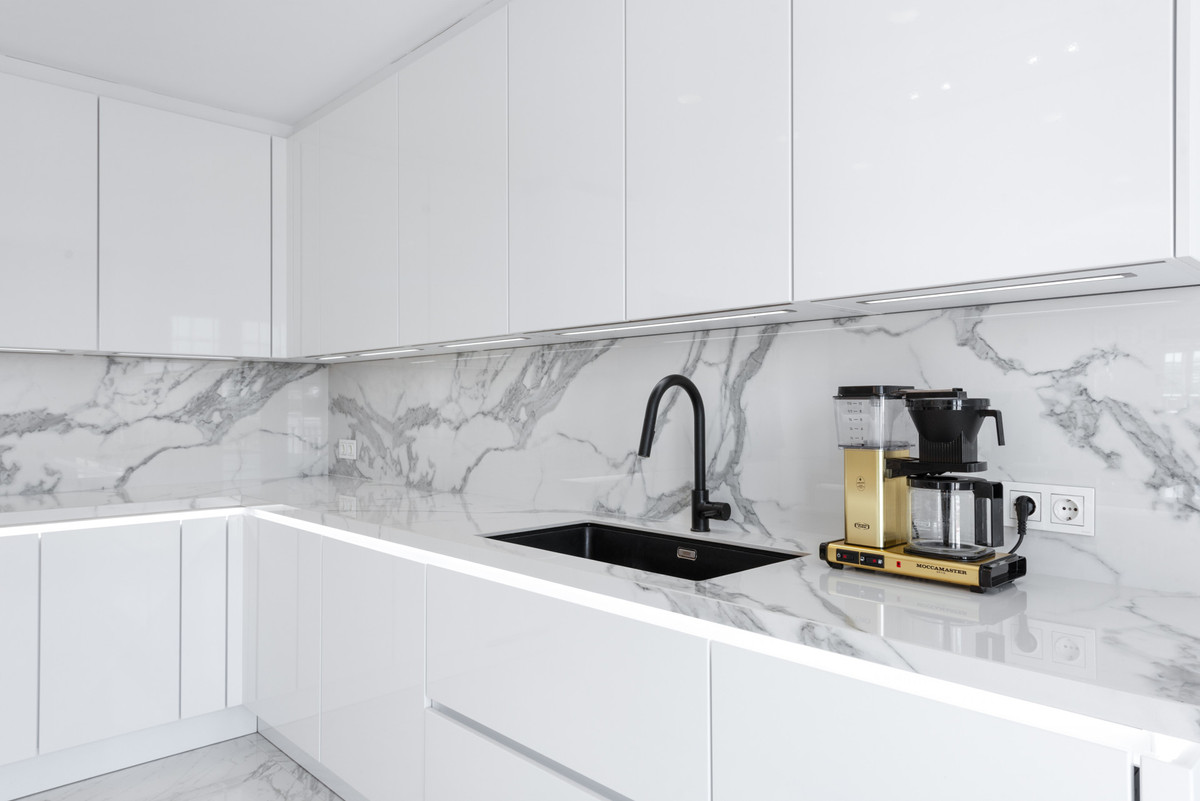 The spacious open-plan kitchen and living area is filled with natural light and designed for both comfort and style. The modern kitchen is fully equipped with integrated Neff appliances, while the elegant living room features a beautiful ethanol fireplace, creating a warm and inviting atmosphere.