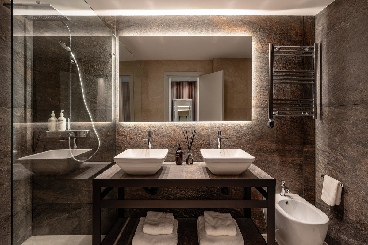 At the heart of the house is a thoughtfully designed living area, where natural light and selected materials create an elegant and relaxing atmosphere. The custom-designed kitchen, equipped with Gaggenau appliances, seamlessly integrates with the dining and living areas, ideal for both daily living and entertaining guests.
