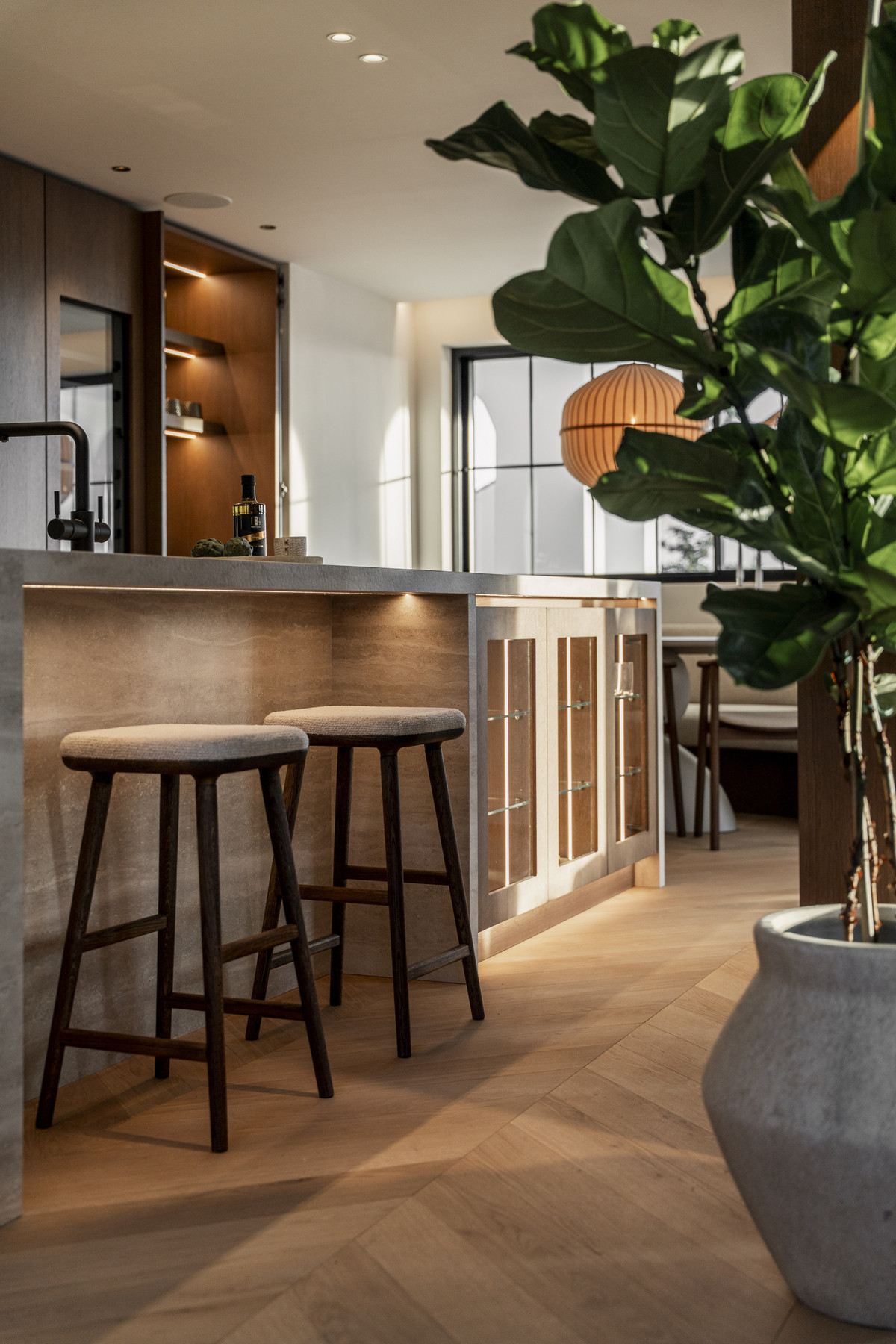 À l'intérieur, la maison se distingue par un choix élégant de matériaux, notamment un parquet à chevrons qui confère chaleur et raffinement à chaque pièce. La cuisine Danespan allie design épuré et fonctionnalité, créant un espace convivial et chaleureux, idéal pour le quotidien et les réceptions. La villa offre cinq chambres spacieuses, judicieusement réparties pour le confort de la famille et des invités. L'espace bien-être comprend une piscine intérieure, un sauna et un hammam, offrant une expérience de spa privée au sein même de la maison.