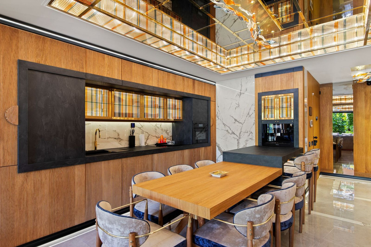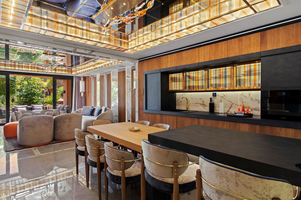 Cette propriété a fait l'objet d'une rénovation complète de très haute qualité, avec un projet de design intérieur sur mesure où chaque élément a été réalisé sur commande. Cuirs naturels, soies et bois précieux se marient harmonieusement avec le travail d'artisans spécialisés, tandis que des décorations en verre soufflé et des pièces uniques ornent l'ensemble. Le résultat est une résidence exceptionnelle, sans équivalent sur le marché actuel.