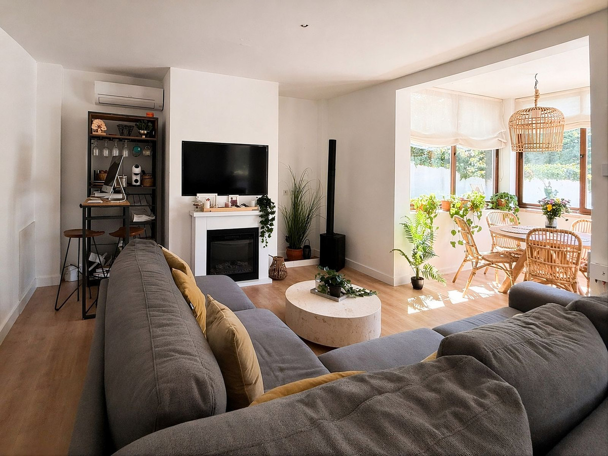 La maison principale, récemment rénovée, offre 88 m² habitables, judicieusement répartis en deux chambres spacieuses, une salle de bain complète et un espace de vie convivial avec cheminée, créant une atmosphère chaleureuse et élégante en toute saison. De grandes fenêtres laissent entrer une abondante lumière naturelle et favorisent une transition harmonieuse avec la verdure environnante.