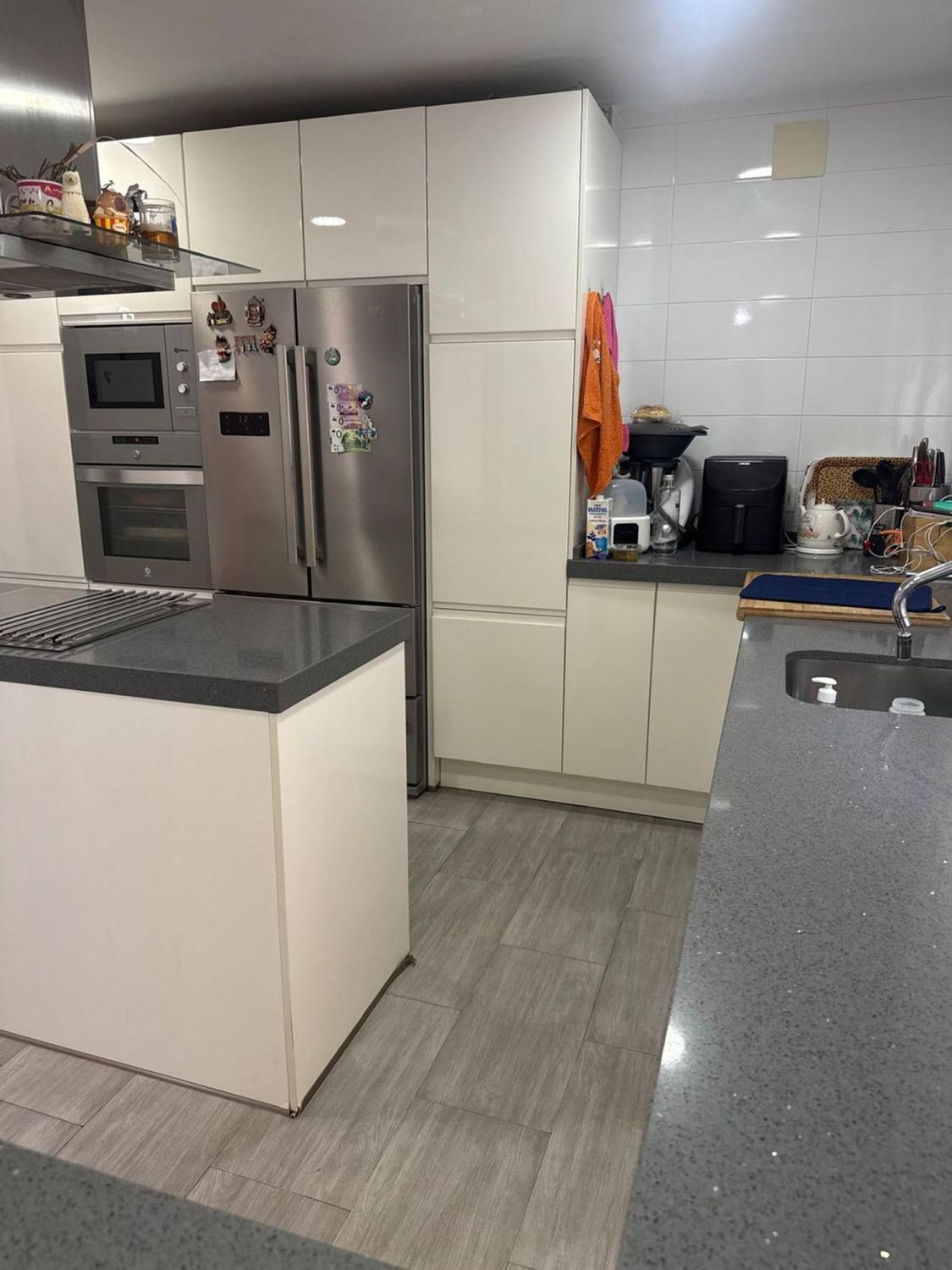 Modern, spacious, and functional designer kitchen, equipped with a central island and multiple storage cabinets.